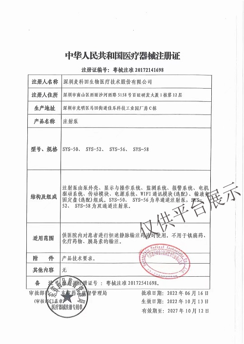 11、報(bào)警:注射將完成(殘留量)、注射器推空、注射完成、注射阻塞、電池電量低、電池電量嚴(yán)重短缺、無(wú)電池、無(wú)外部電源、注射器無(wú)法識(shí)別、推頭安裝不正確、注射泵自檢和運(yùn)行過(guò)程故障自動(dòng)診斷報(bào)警、遺忘操作。